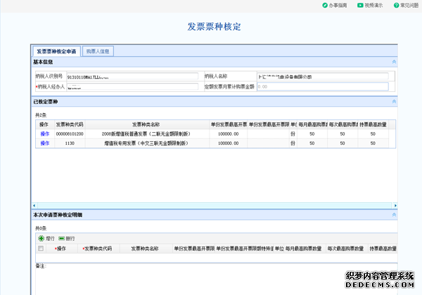 1、发票税种核定 点击发票办理-发票票种核定-进去之后填写纳税人经办人-办理申请票种核定明细下面有一个增行,点击进去后选择您所要核定的票种,但是新办企业先要添加购买人信息,添加完成后才能提交发票票种核定。 如图三: