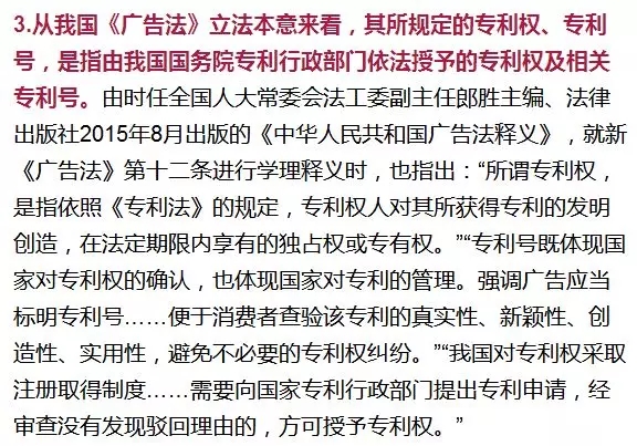 有人认为,《广告法》前述规定并未限定为中国专利,因此,虽未取得中国专利权,但取得境外专利权的,可以在商业广告中宣传其取得境外专利权,只要准确标明境外专利号、专利种类及授予专利权的国别地域即可。如,在广告中如实宣传“美国发明专利、专利号××××”之类的,不违反我国《广告法》。