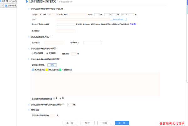 在出来的页面上填写:您注册地址信息、房产证号码、您的联系方式、营业期限、经营范围、从业人数等信息后再点击下一步,如图所示: